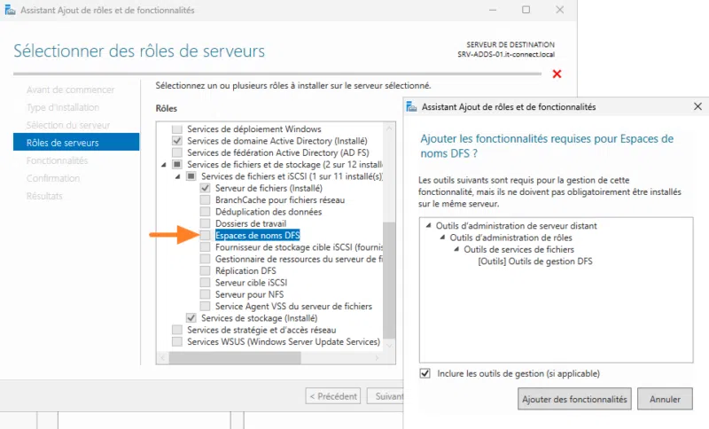 4 - L'étape "Rôles de serveurs" se présente à vous. Cliquez sur la flèche à gauche de « Service de fichiers et de stockage » pour dérouler la catégorie, puis sous « Services de fichiers et iSCSI », cochez le rôle intitulé « Espaces de nom DFS ». Une fenêtre apparaît, cliquez sur « Ajouter des fonctionnalités » pour installer les fonctionnalités nécessaires au bon fonctionnement du rôle. Cliquez sur « Suivant » deux fois.