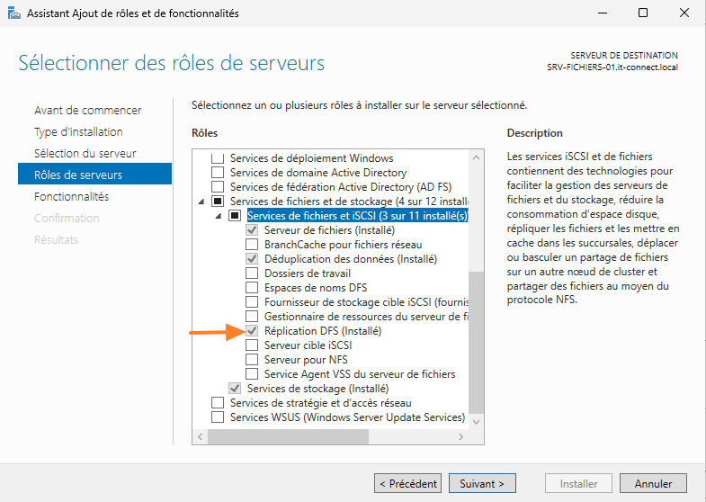 Pour effectuer l'installation du rôle "DFSR" via l'interface graphique de Windows, suivez les étapes ci-dessous. Nous l'installerons sur le serveur "SRV-FICHIERS-01.it-connect.local" sur lequel le rôle DFS est déjà en place.