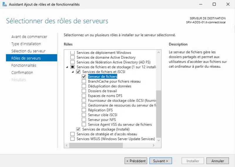 À l'étape "Rôles de serveurs", vous devez cocher le rôle "Serveur de fichiers" situé sous "Services de fichiers et de stockage" puis "Services de fichiers et iSCSI".