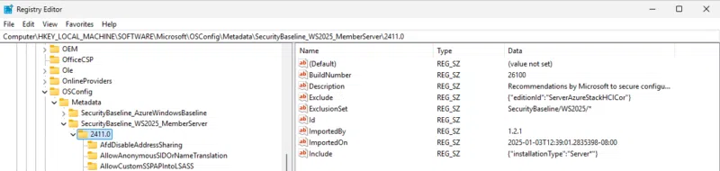 Get-OSConfigDesiredConfiguration -Scenario SecurityBaseline/WS2025/MemberServer