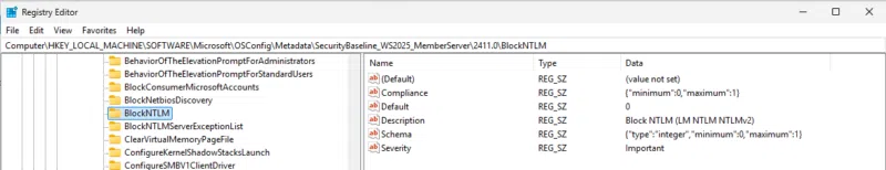 Ici sous la clé SecurityBaseline_WS2025_MemberServer, nous retrouvons la version 2411 de la Security Baseline puis la version du module 2.1 et même la date d’importation du module. Pour faire un peu de sécurité, chercher et cliquez sur la clé « BlockNTLM ».