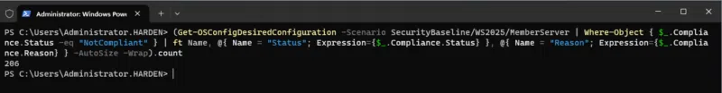 (Get-OSConfigDesiredConfiguration -Scenario SecurityBaseline/WS2025/MemberServer | Where-Object { $_.Compliance.Status -eq "NotCompliant" } | ft Name, @{ Name = "Status"; Expression={$_.Compliance.Status} }, @{ Name = "Reason"; Expression={$_.Compliance.Reason} } -AutoSize -Wrap).count