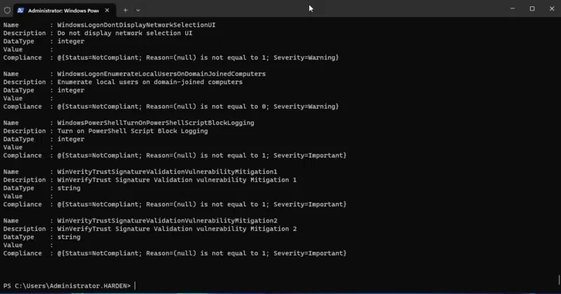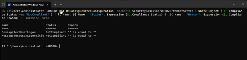 Get-OSConfigDesiredConfiguration -Scenario SecurityBaseline/WS2025/MemberServer | Where-Object { $_.Compliance.Status -eq "NotCompliant" } | ft Name, @{ Name = "Status"; Expression={$_.Compliance.Status} }, @{ Name = "Reason"; Expression={$_.Compliance.Reason} } -AutoSize -Wrap