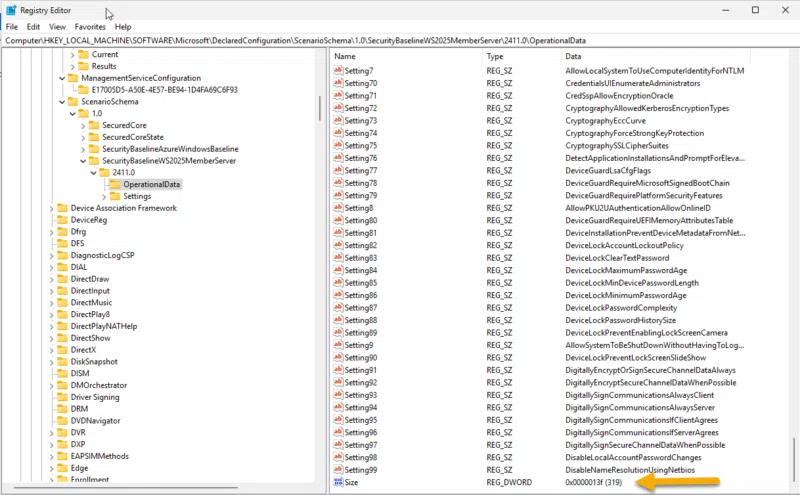 - 3 - Nous pouvons observer la baseline « SecurityBaselineW2025MemberServer » avec la version « 2411 » et sous « Settings » l’ensemble des paramètres appliqué à la machine. Dans « OperationalData », nous retrouvons une clé « Settings[incréments] » et dans notre cas, nous avons « 319 » paramètres appliqués.