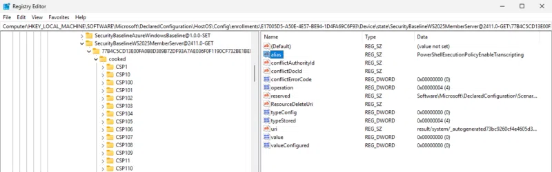 Ici, par exemple, nous retrouvons l’ensemble des clés dans la base de registre pour activer la journalisation des scripts Powershell que OSConfig a appliqué.