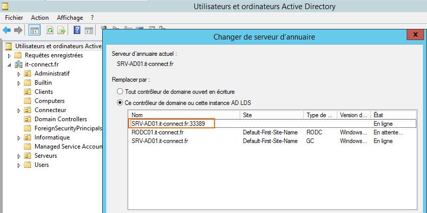 Si j’ouvre la console dsa.exe, je suis bien connecté à mon AD, mais je ne peux pas changé de contrôleur de domaine, impossible de contacter le serveur, le serveur est indisponible.