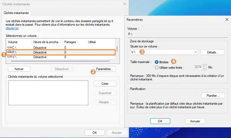 Ensuite, sélectionnez le volume "P:\" dans la liste (1) puis cliquez sur le bouton "Paramètres" (2). Une nouvelle fenêtre s'ouvrira. Commencez par sélectionner "V:\" comme emplacement pour stocker les clichés instantanés (3), puis sélectionnez "Illimité" comme "Taille maximale" (4) puisque le volume est dédié à cet usage.