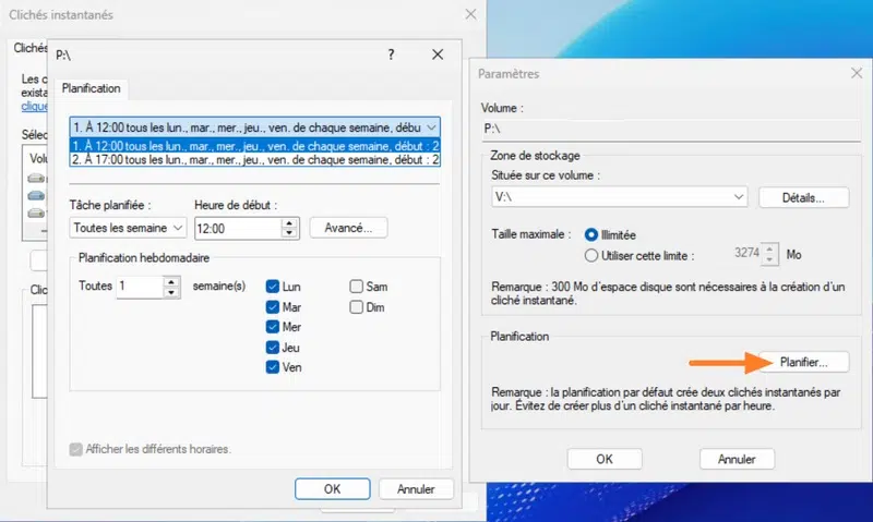 Il nous reste à configurer la planification, en cliquant sur "Planifier". Il est possible de créer une multitude de déclencheurs pour créer des clichés instantanés de ce volume. La liste déroulante affiche l'ensemble des tâches planifiées de ce volume : il ne s'agit pas de choisir.