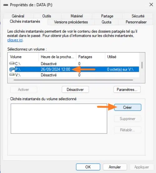 Ensuite, accédez aux propriétés du volume "P:" pour vérifier la configuration. Sur l'onglet "Clichés instantanés", nous pouvons voir l'heure de la prochaine d'exécution. Nous pouvons aussi cliquer sur "Créer" pour créer un snapshot dès maintenant.