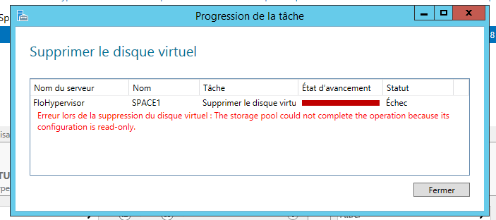 "Erreur lors de la suppression du disque virtuel : The storage pool could not complete the operation because its configuration is read-only"