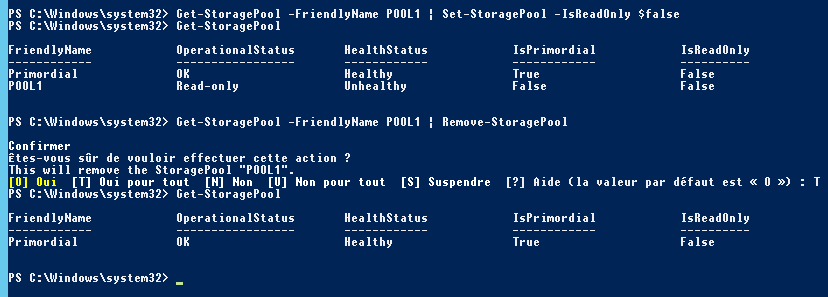 Enfin, tant qu'on est en PowerShell, on en profite pour supprimer le pool de stockage via Remove-StoragePool :