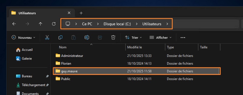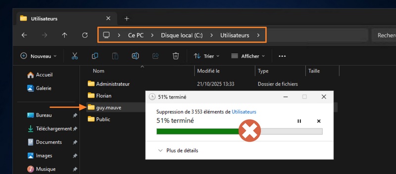 Si vous avez déjà supprimé le dossier de l'utilisateur dans C:\Utilisateurs (C:\Users), sachez qu'il y a une issue possible. C'est d'ailleurs le point de départ de la première méthode évoquée dans cet article. Ici, nous prendrons l'exemple de l'utilisateur suivant : guy.mauve.