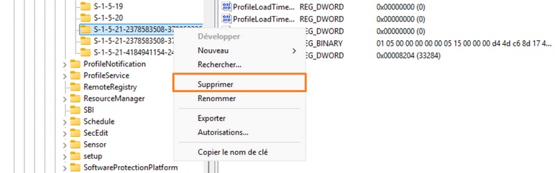 Une fois que vous avez repéré la sous-clé, supprimez-la. Pour cela, effectuez un clic droit dessus puis cliquez sur "Supprimer".