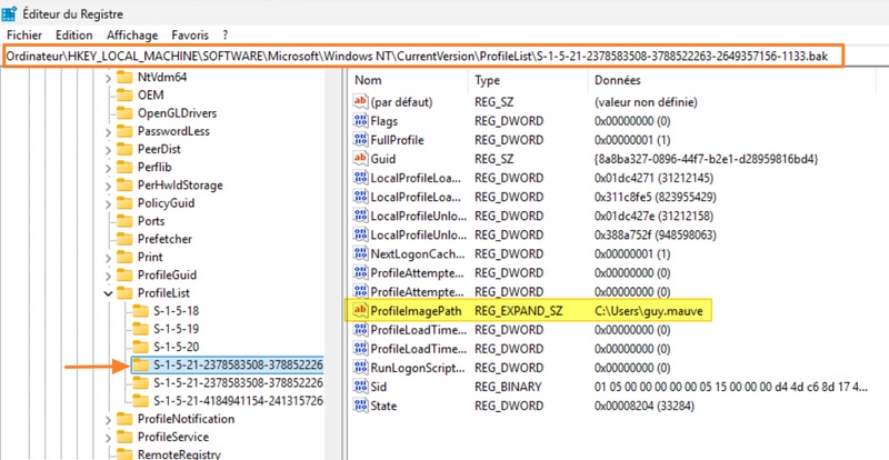 Si vous cliquez sur une des sous-clés, sur la partie de droite, regardez la valeur ProfileImagePath. Elle contient le chemin vers le dossier de profil de cet utilisateur, ce qui permet de savoir à quel utilisateur correspond la sous-clé. L'idée est simple : repérer la clé correspondante à l'utilisateur pour lequel vous venez de supprimer le dossier de profil. Soit, pour ma part :