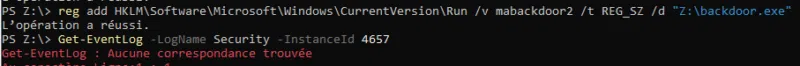 J'utilise ensuite la CmdLet PowerShell "Get-EventLog" pour récupérer les évènements 4657 – A Registry Value Was Modified relatifs à la modification d'une clé de registre :