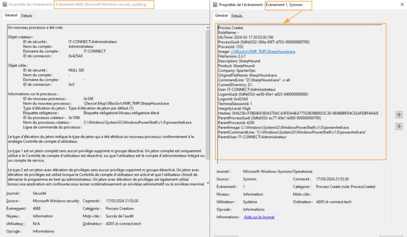 L'eventID 1 (à droite de l'image) créé par Sysmon est beaucoup plus verbeux en contenu technique. Il fournit plus d'informations de contexte autour de l'exécution du processus. Ces informations vont notamment grandement faciliter la recherche et la détection d'activité malveillante qui ont lieu sur le système.
