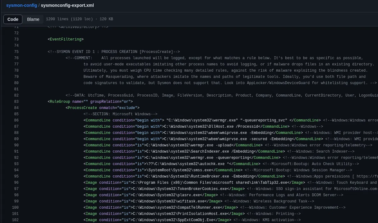 Nous allons notamment nous baser sur des configurations connues et éprouvées créées par la communauté de la cybersécurité. La configuration la plus connue est celle proposée par SwiftOnSecurity, consultable et téléchargeable ici : Github - SwiftOnSecurity :