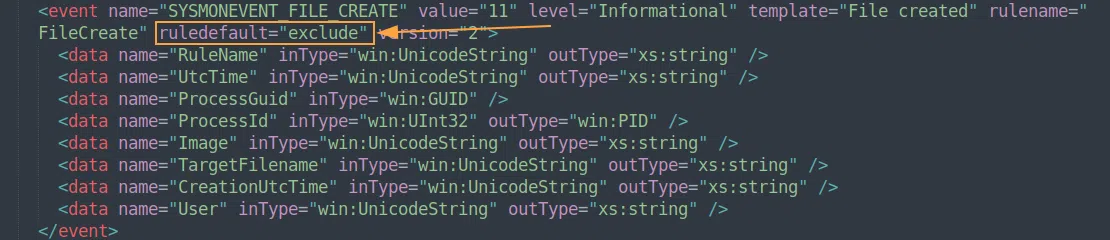 Ici, nous voyons dans un premier temps la définition de l'event ID avec son nom et son ID ("1"). Les sections précédentes de cet article contiennent déjà un exemple d'évènement créé via cette règle, vous pourrez donc voir les champs déclarés par la configuration dans cet évènement. Par défaut, la journalisation de cet évènement est activée ("ruledefaut=include"). Ce qui n'est pas le cas de tous les évènements, exemple avec l'évènement "11 - Process Create" :