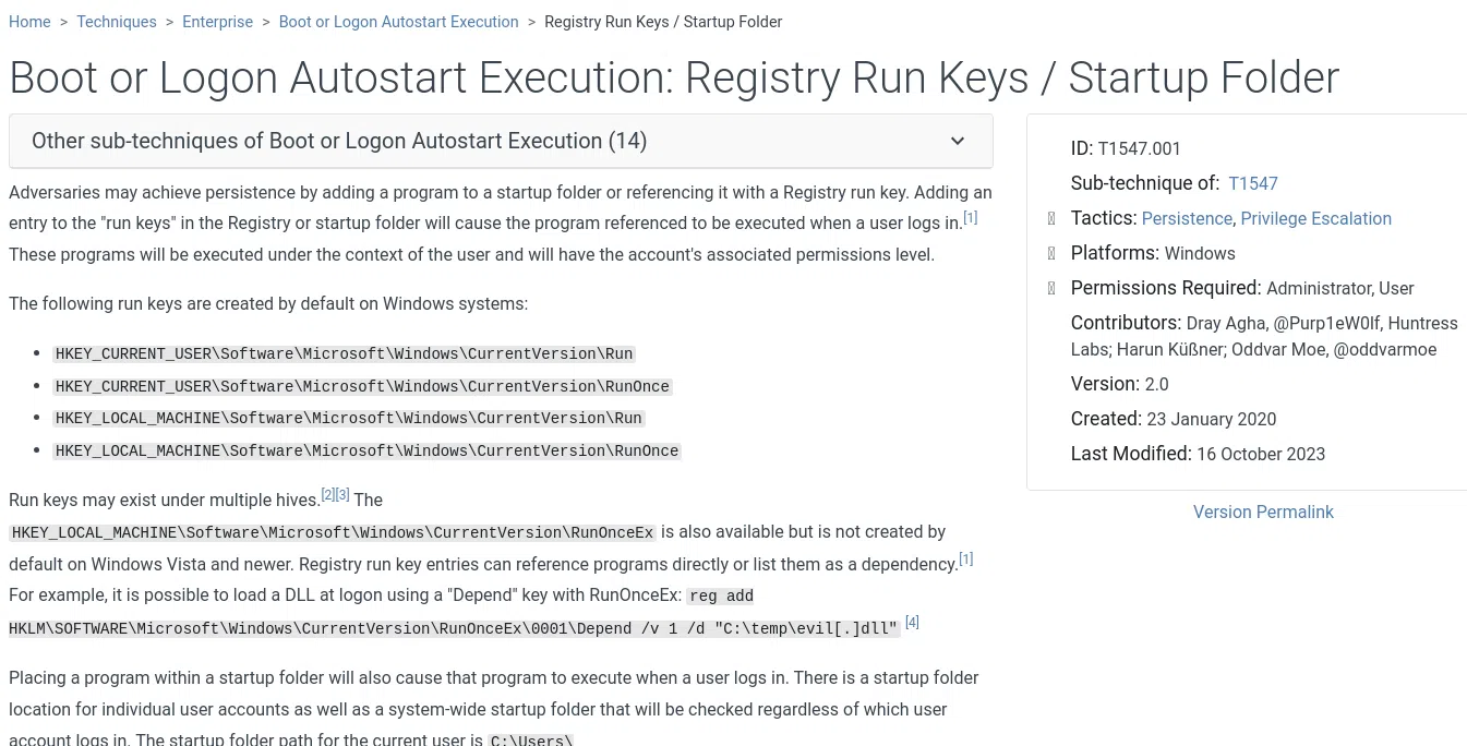 Pour mieux comprendre l'intérêt et les bénéfices de cette information, regardons par exemple le contenu du TTP T1060 sur le site du framework MITRE ATT&CK (le framework ayant été mis à jour récemment, l'action au TTP 1060 rédige vers son nouvel identifiant : T1547.001 - Boot or Logon Autostart Execution: Registry Run Keys / Startup Folder ):
