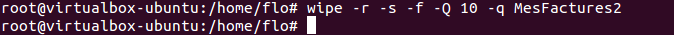 Si vous utilisez la commande indiquée ci-dessus, Wipe vous retournera un message vous indiquant d’utiliser l’option « -r ». Enfaite, cette option inclus la récursivité c’est-à-dire que ça supprimera MesFactures et tout ce qu’il contient. Il paraît logique de se dire qu’on ne va pas supprimer uniquement le dossier sans supprimer ce qu’il contient, sinon il manquera une partie de l’arborescence, d’où cette obligation d’utiliser cette option lorsque le dossier n’est pas vide. Si vous souhaitez effacer les données d’une arborescence, il vous suffit d’indiquer l’option « -r » pour la récursivité et tout le contenu du répertoire sera déchiqueté.