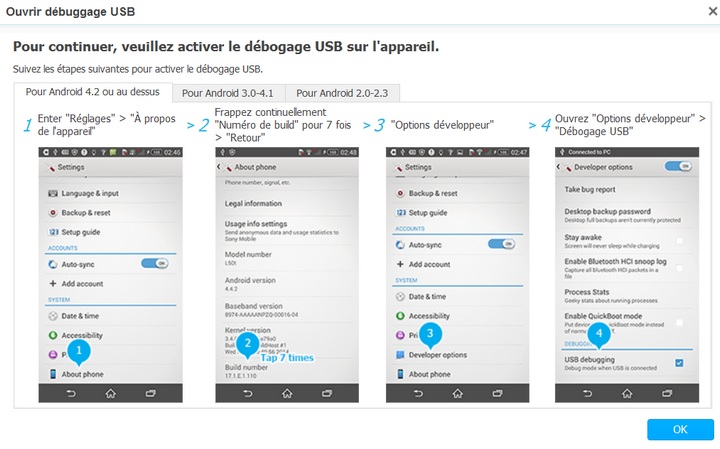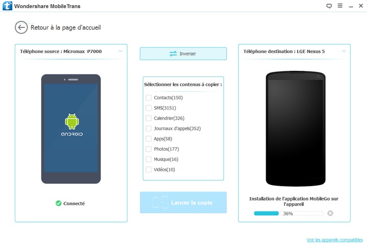 Vous devez - par l'intermédiaire des options développeurs - activer le débogage USB sur vos appareils (source et destination), ceci déclenchera depuis votre PC l'installation de l'application MobileGo, éditée par Wondershare également.