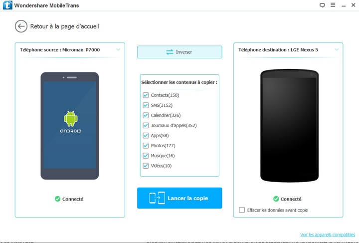 L'option "Effacer les données avant copie" permet de remettre propre le téléphone de destination avant de venir copier vos données. Si vous souhaitez fusionner les données existantes et les nouvelles données, ne cochez pas cette case. Pour lancer le processus, il suffit de cliquer sur "Lancer la copie".