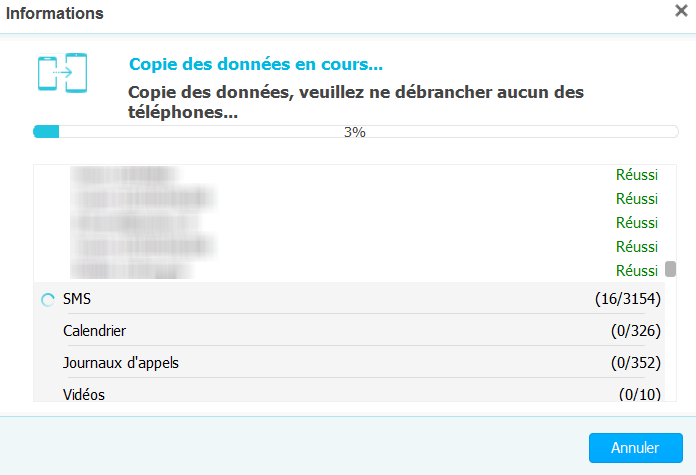 Je trouve que le transfert des SMS est assez lent comparé à d'autres applications, c'est peut être le fait de passer par l'intermédiaire du PC qui fait cela. Sinon pour le reste, la copie est rapide.