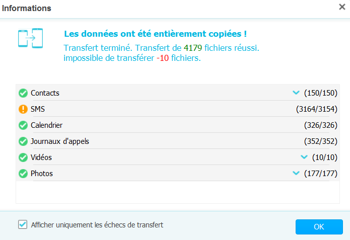 De manière générale la migration s'est bien déroulée, il y a toutefois le résultat final qui me laisse perplexe. En effet, l'application a transféré plus de SMS que j'en avais sur l'appareil (3164 sur 3154) ce qui génère un avertissement. Malgré tout, l'ensemble de mes données sont bien arrivées de l'autre côté du tunnel.