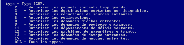 Nous utiliserons la valeur « 8 » qui correspond à « Autoriser les demandes d’échos entrantes » c'est-à-dire qu’on autorise les autres machines à faire un ping sur ce serveur.