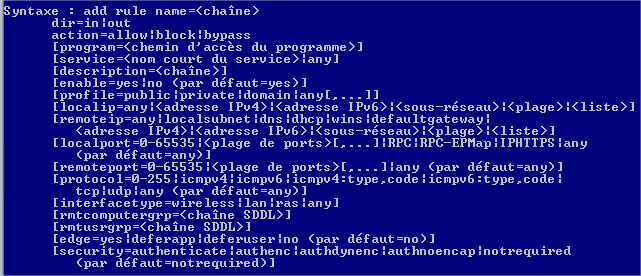 L’utilitaire netsh permet de gérer plusieurs éléments réseaux y compris le pare-feu, nous allons donc l’utiliser. La syntaxe de la commande est la suivante :