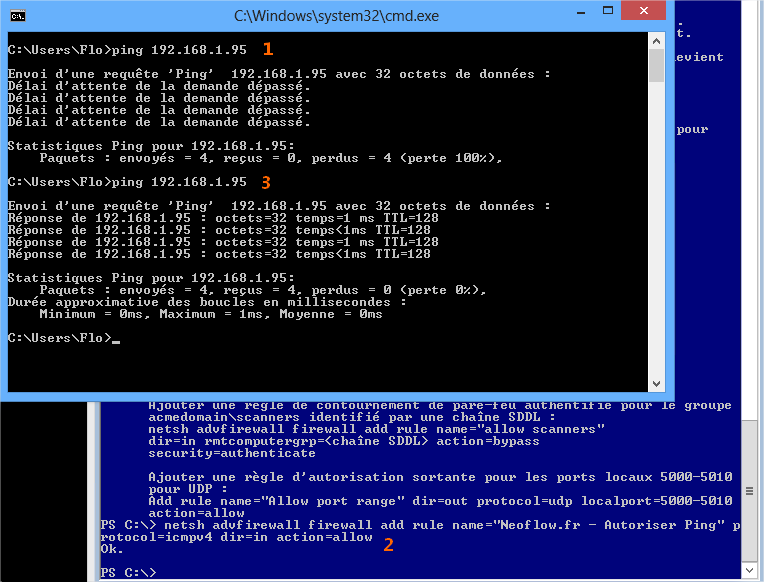 netsh advfirewall firewall add rule name="Neoflow.fr – Autoriser Ping" protocol=icmpv4 dir=in action=allow