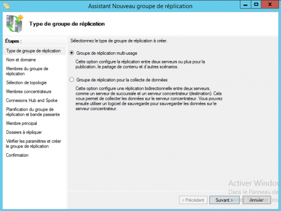 Commencez par sélectionner le type de groupe de réplication. Pour assurer la haute disponibilité des données comme nous souhaitons le faire ici, il est préférable de rester sur le "Groupe de réplication multi-usage". Le second scénario est utile si vous avez plusieurs serveurs de fichiers sur différents sites et que vous souhaitez collecter toutes les données sur un serveur central. Ce serveur est le seul à contenir les données de tous les serveurs de tous les sites.