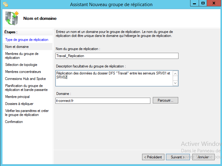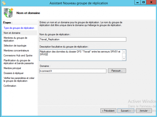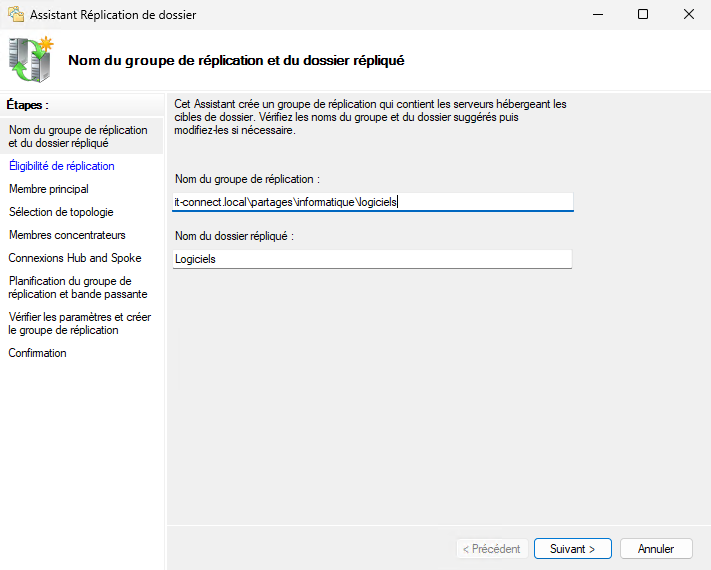 Nommez le groupe de réplication, par exemple "SYNC-LOGICIELS", indiquez une description et poursuivez.