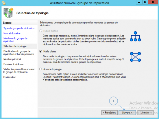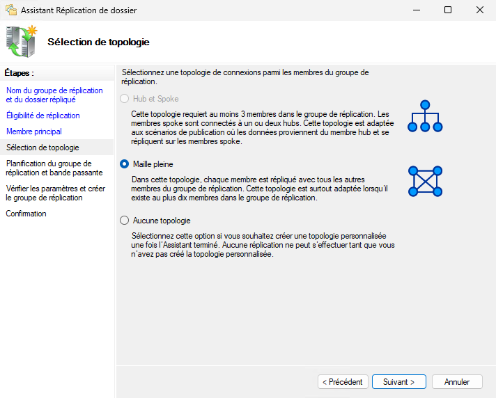 À l'étape suivante, vous devez définir le type de topologie. Avec seulement 2 membres, nous devons partir sur la topologie "Maille pleine" à moins de créer une topologie personnalisée. Avec cette topologie, la réplication sera bidirectionnelle entre les 2 serveurs.