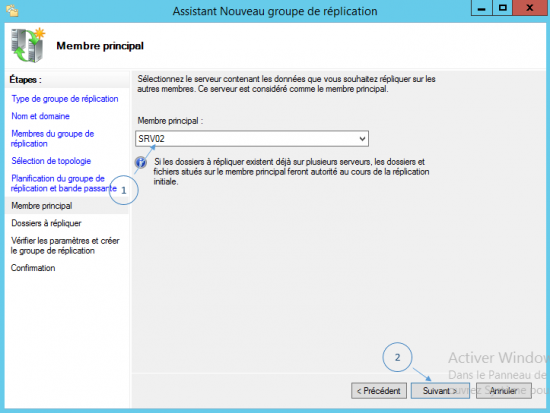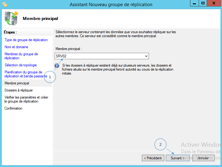Désormais, sélectionnez le membre principal, c'est-à-dire le serveur source qui contient déjà les données à répliquer. Ici, c'est le serveur "SRV-FICHIERS-01" qui est sélectionné.