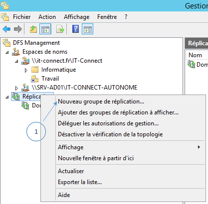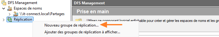 Ouvrez la console « Gestion du système de fichiers distribués DFS », puis faites un clic droit sur la section « Réplication » et cliquez sur « Nouveau groupe de réplication ».
