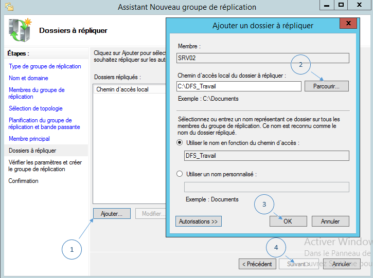 À l'étape suivante, vous devez sélectionner le répertoire à répliquer. Dans notre cas, il s'agit du partage "Logiciels" hébergé sur le serveur "SRV-FICHIERS-01", donc je précise son chemin local sur ce serveur, via le bouton "Ajouter".