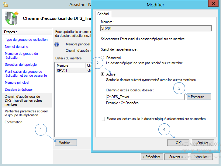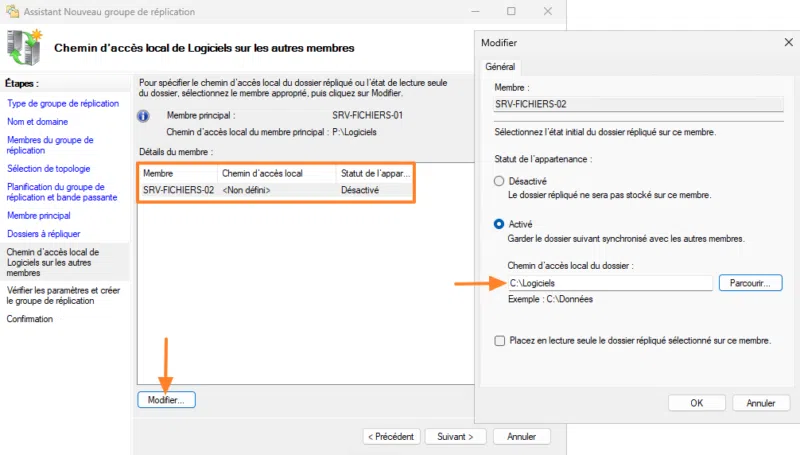 À l'étape qui suit, le second serveur membre du groupe sera précisé. Vous devez cliquer sur "Modifier" pour indiquer où se situe le répertoire cible "Logiciels" sur ce serveur. C'est important de le préciser, surtout si les 2 serveurs ne sont pas structurés de la même façon. Il est à noter que vous pouvez définir ce répliqua de données en lecture seule uniquement en cochant l’option adéquat.