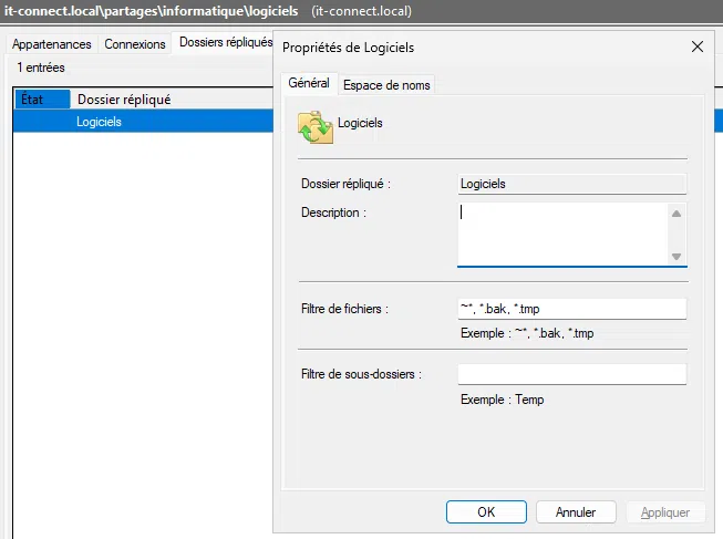 Il est à noter que la configuration par défaut du DFSR applique certaines règles de filtrage concernant la synchronisation des fichiers. Plusieurs filtres s’appliquent afin d’exclure des fichiers :