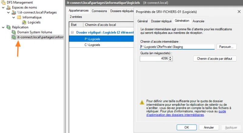 Pour accéder à configuration, accédez aux propriétés du groupe de réplication précédemment créé. Puis, dans l'onglet "Génération" vous pouvez ajuster la taille du quota pour la file d'attente, tandis que le second quota pour les fichiers en conflit et supprimés se configure via l'onglet "Avancée".