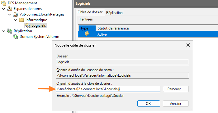 Dans la console DFS, cliquez sur le dossier "Logiciels" et à partir du clic droit, ajoutez une nouvelle cible de dossier. Ainsi, vous allez spécifier le chemin UNC vers le partage "Logiciels$" sur le serveur "SRV-FICHIERS-02".
