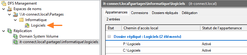 Le groupe de réplication est visible et le dossier DFS "Logiciels" dispose d'un icône spécifique permettant de voir qu'il est répliqué via DFSR.