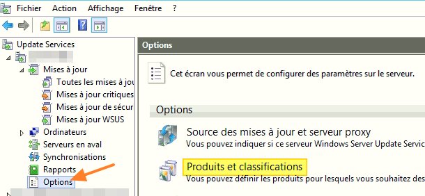 Vous devez commencer par ouvrir la console WSUS, puis sur la gauche sous votre nom de serveur, cliquez sur "Options". Cliquez ensuite sur "Produits et classifications".