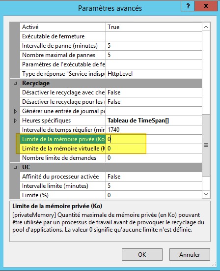 Descendez jusqu'à la section "Recyclage" jusqu'à trouver l'option "Limite de la mémoire privée (Ko)" qui par défaut est définie sur la valeur 1 258 015 Ko soit environ 1,2 Go de mémoire. Il est nécessaire d'augmenter cette valeur ou alors de la définir sur "0" pour que ce soit illimité.