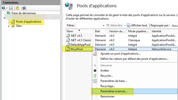 En administrateur sur le serveur, ouvrez le Gestionnaire IIS. Sur la gauche, déroulez jusqu'à "Pools d'applications" : effectuez un clic droit sur "WsusPool" puis "Paramètres avancés".