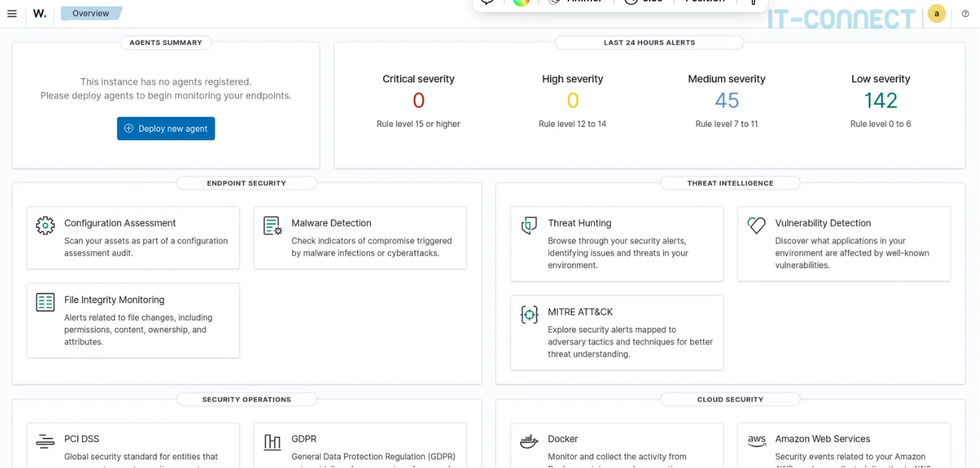 Et voilà, notre Wazuh est installé ! Vous pouvez à présent naviguer dans l’interface de gestion et de configuration.