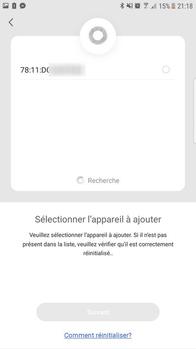 Si tout va bien, votre bande LED doit apparaître dans la liste grâce à la découverte effectuée par l'application. Si ce n'est pas le cas, réinitialisez votre bandeau LED : débranchez électrique, puis rebranchez tout en restant appuyé sur le bouton pendant environ 5 secondes jusqu'à ce que le bandeau LED clignote de plusieurs couleurs, et relâchez.