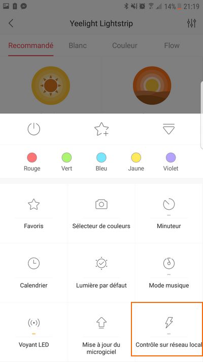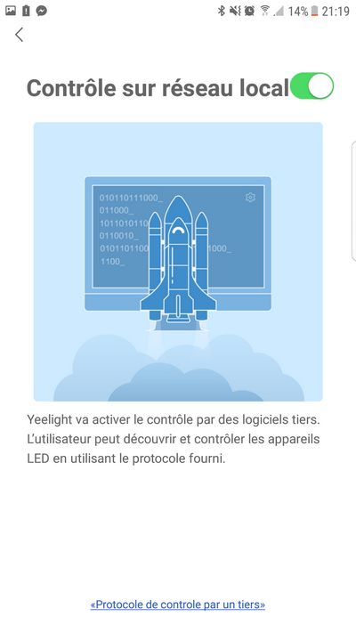 Je n’ai pas tout a fait le même menu, probablement une version plus récente de l’application sur Android, impossible de trouver contrôle sur réseau local, du coup un scan Yeelight ne me donne rien sur Jeedom.