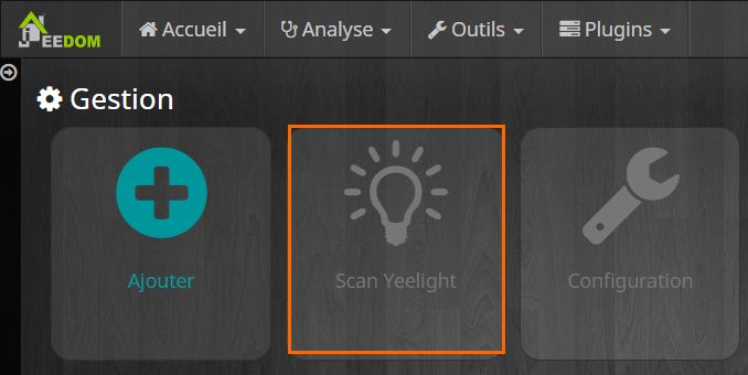 Au sein du plug-in Xiaomi Home, vous avez une section "Gestion" qui contient un bouton "Scan Yeelight". Cliquez dessus pour déclencher l'analyse sur votre réseau local.